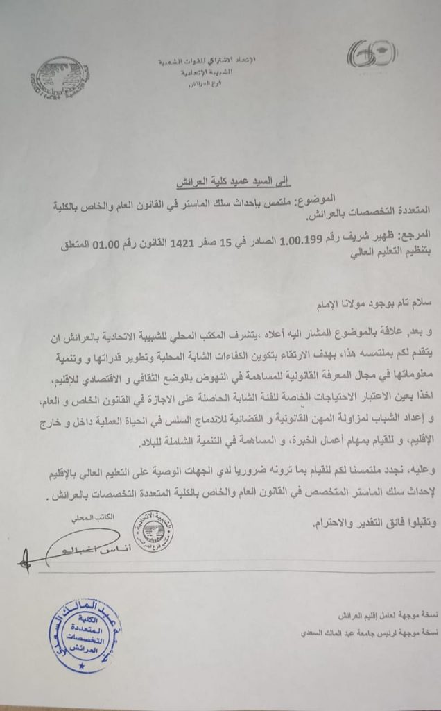 قام المكتب المحلي للشبيبة الاتحادية بالعرائش بتقديم ملتمس لإحداث ماستر القانون العام والخاص لصالح الطلبة الحاصلين على الإجازة في القانون بالإقليم، وذلك إلى كل من السادة عامل إقليم العرائش، ورئيس جامعة عبد المالك السعدي بتطوان، وعميد الكلية المتعددة التخصصات بالعرائش، وهو كله أمل في أن تتم الاستجابة لهذا الملتمس الذي سيفتح آفاقا علمية مهمة للشابات والشباب بالإقليم.