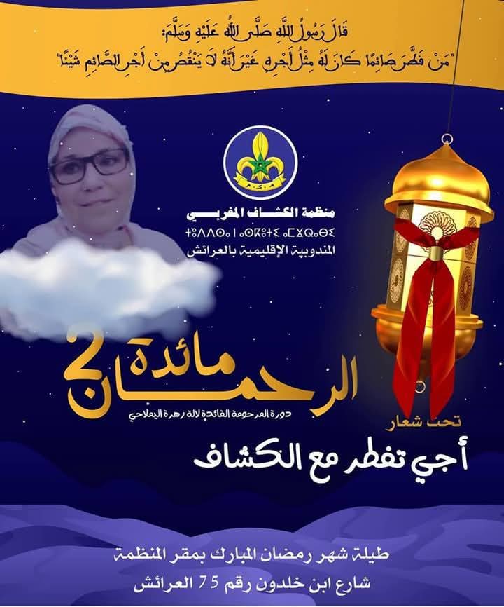 في أجواء رمضانية تسودها قيم التكافل والتضامن، نظمت الكشفية المغربية بالعرائش مائدة الرحمان في يومها الخامس عشر من شهر رمضان المبارك، وذلك ترحماً على روح القائدة الراحلة زهراء اليملاحي، التي كانت مثالاً للعطاء والخدمة المجتمعية.