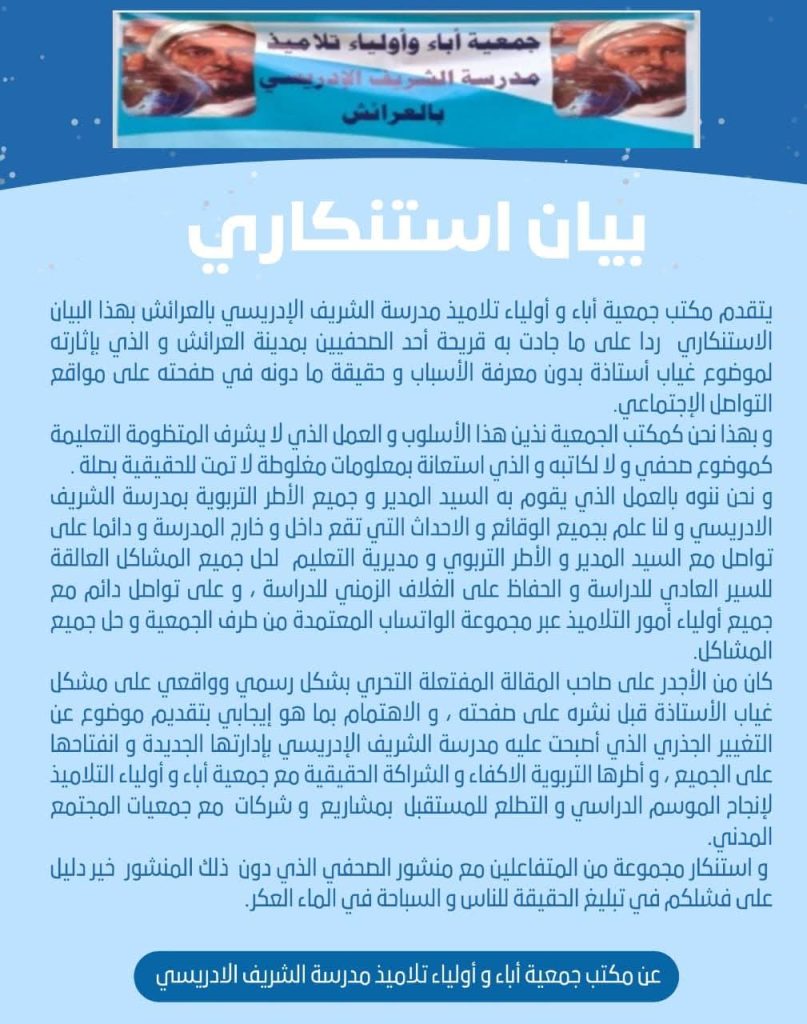 جمعية آباء مدرسة الشريف الإدريسي ترد على تدوينة “غياب أستاذة بدون مبرر” والمعنية تلجأ للقضاء