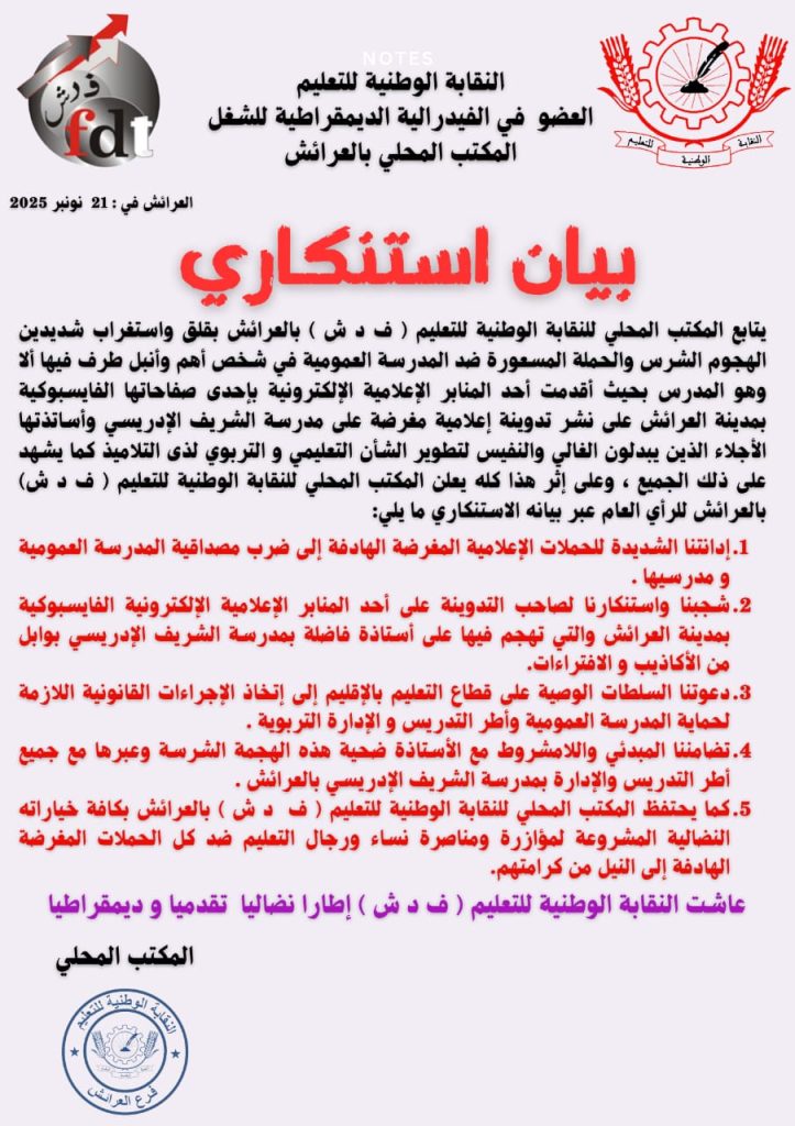 وأشار المكتب المسير إلى أن جميع الأنشطة التربوية تسير بشكل طبيعي، وأن أي غياب يسجل يتم وفق الإجراءات القانونية المعمول بها داخل قطاع التعليم، وفي احترام تام لحقوق المتعلمين وواجبات الأطر التربوية.
