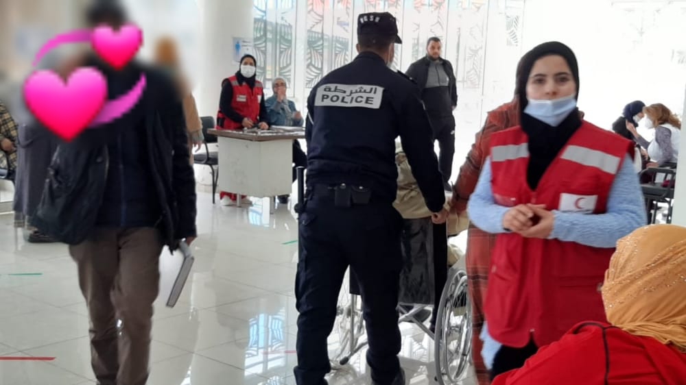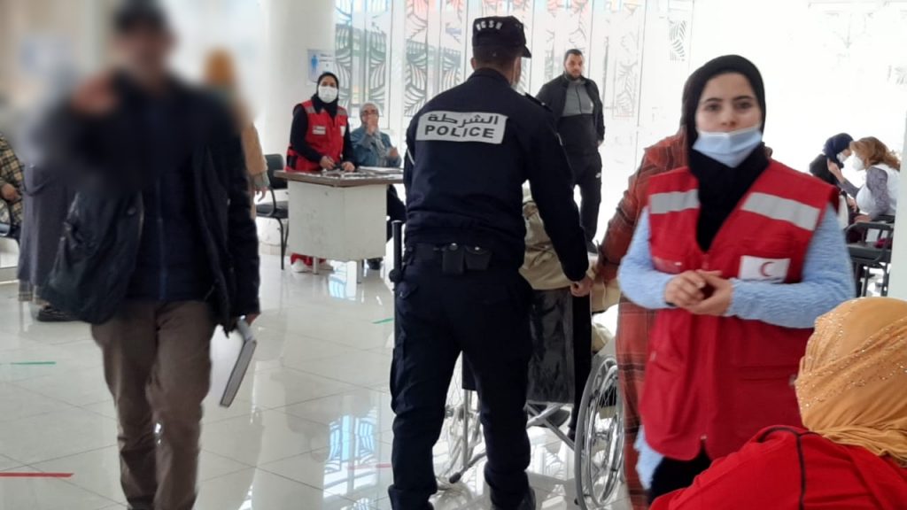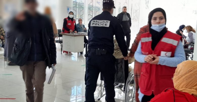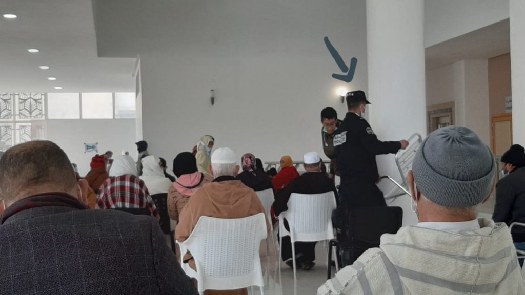 وشوهد عنصر الأمن المعني بالأمر، وهو يأخذ بطائق التعريف من عند المواطنين مباشرة بعد دخولهم، وكلهم من كبار السن، ثم يوجههم للجلوس في أماكنهم، بل يقوم في حالات وجود العاجزين عن المشي ، بتوفير كرسي متحرك، ويقوم هو شخصيا بدفعهم وإيصالهم للممرضة.