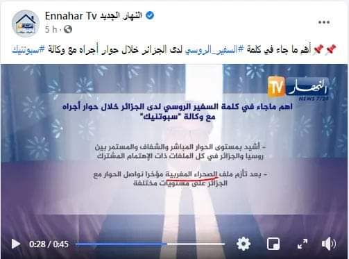 تحت عنوان “أهم ما جاء في كلمة السفير الروسي لدى الجزائر خلال حوار أجراه مع وكالة سبوتنيك” نقلت النهار قول السفير الروسي بالجزائر “بعد تأزم ملف الصحراء المغربية مؤخرا نواصل الحوار مع الجزائر على مستويات مختلفة”، وبعدما تفطنت إلى أن السفير يعترف بمغربية الصحراء قامت النهار تي في بحذف المادة الإعلامية المنقولة عن الوكالة الروسية من كافة الدعامات الالكترونية على مواقع التواصل الاجتماعي.
